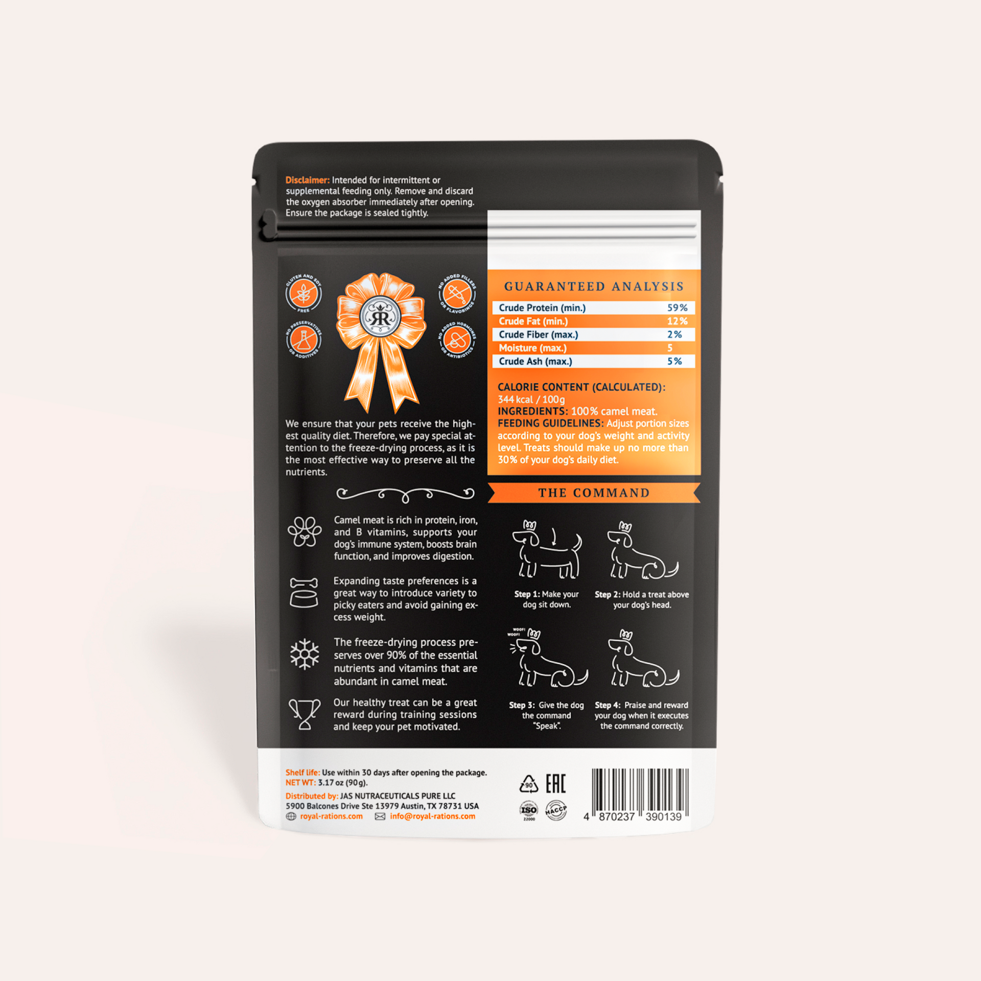 Camel meat is naturally rich in B vitamins, omega-3 fats, phosphorus, and iron, while being low in cholesterol. This means support for healthy skin, strong bones, steady energy, and a happy heart. Our camels are raised freely on open pastures. This ethical and sustainable approach ensures exceptional meat quality rich in essential nutrients. After careful harvesting, the meat is gently freeze-dried in a vacuum at low temperatures to preserve its natural goodness—locking in proteins, vitamins, and authentic flavor without preservatives. Perfect for everyday rewards or as a special healthy snack. Our treats are the smart choice for health-conscious dog owners.