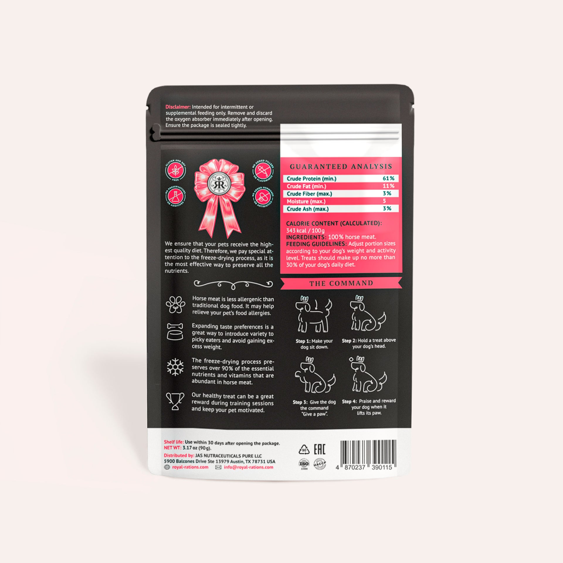 Made from 100% raw horse meat with no additives, these treats are gentle for dogs with food sensitivities. Horse meat is naturally rich in iron, omega-3 fats, potassium, and selenium, while being low in fat. This means support for healthy skin and joints, strong muscles, steady energy, and a strong immune system. Our gentle freeze-drying process locks in nutrients and flavor without preservatives, giving your dog wholesome nutrition in every bite.